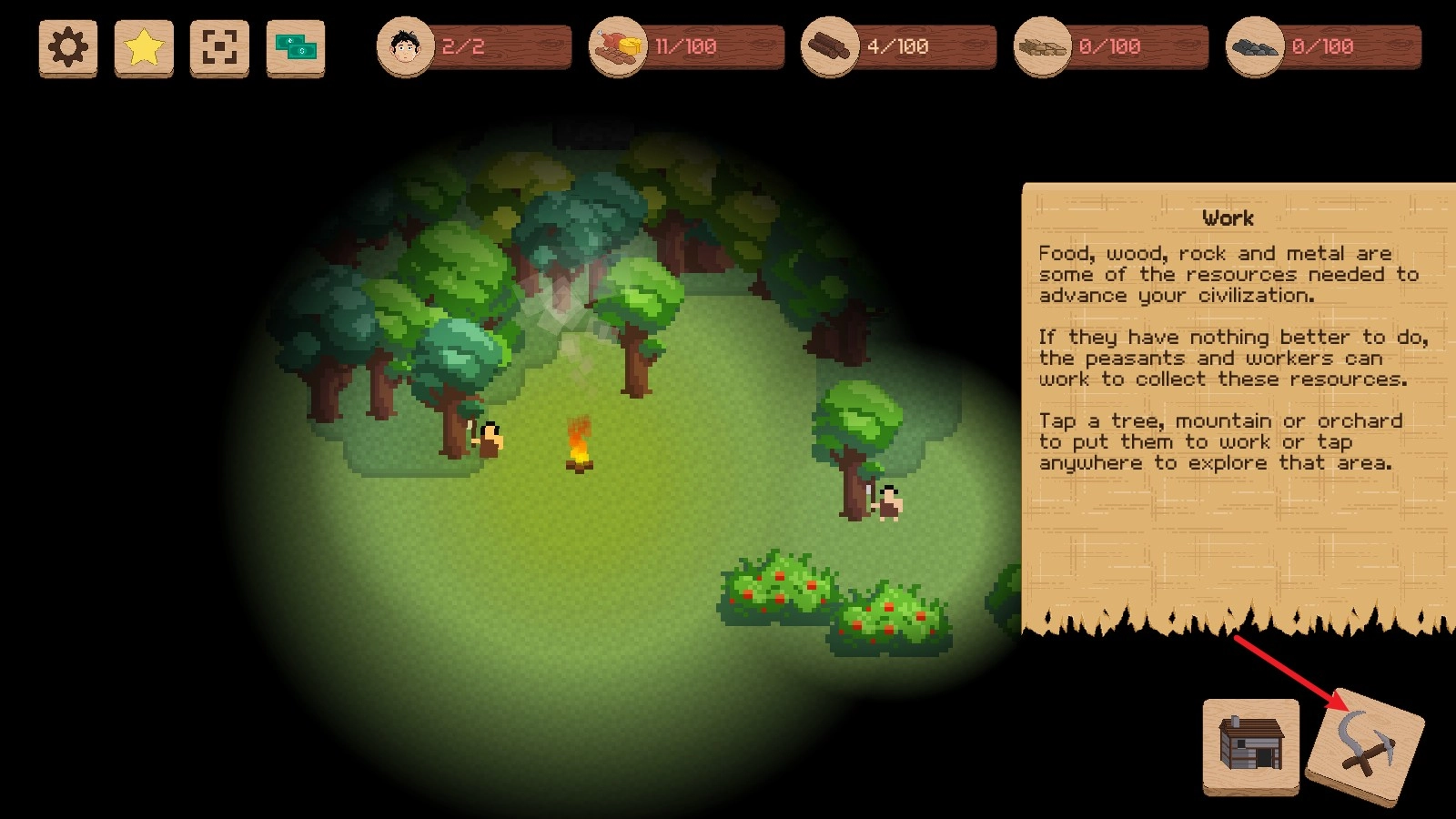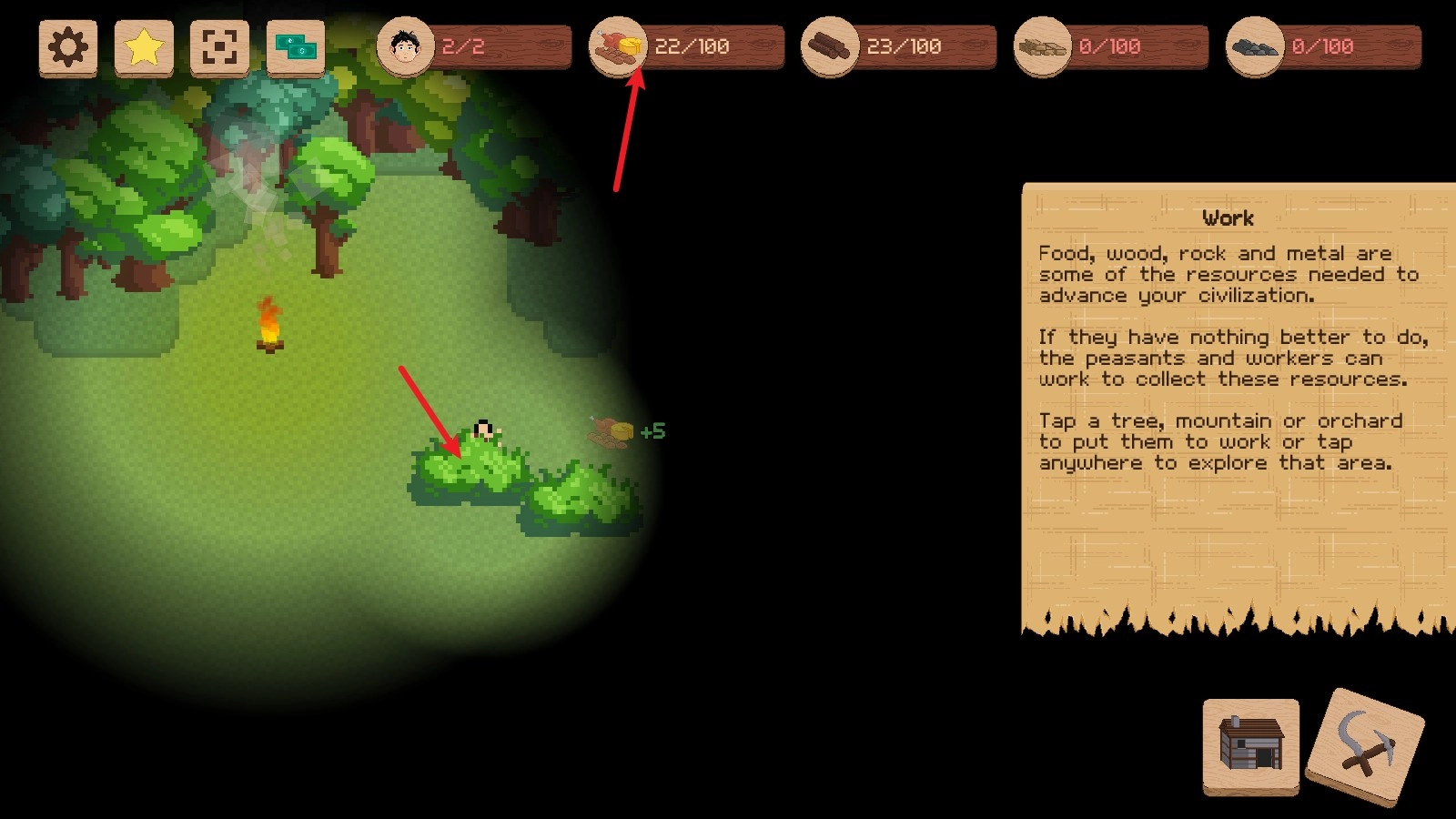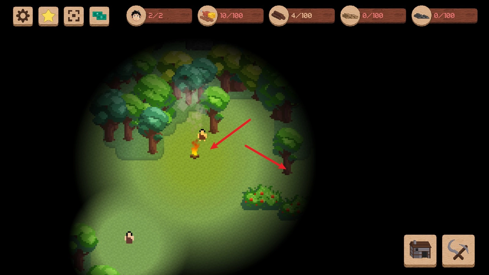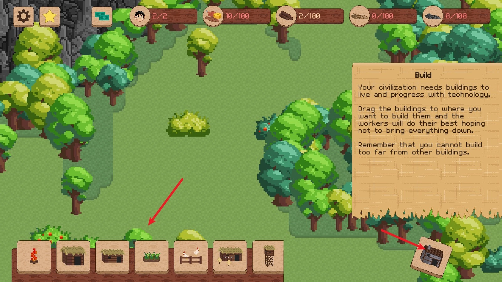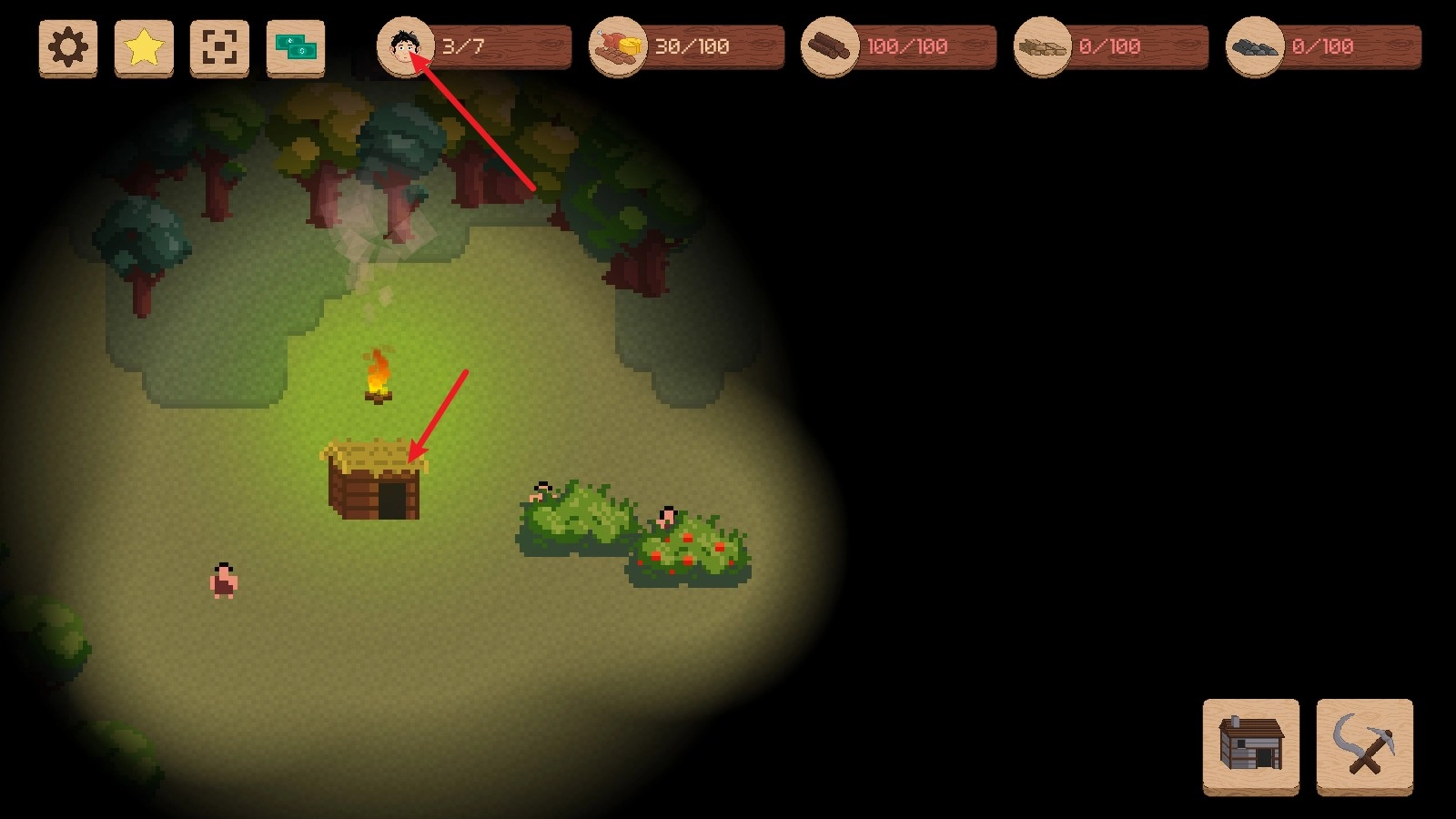 6、等木材储备充足后,我们就可以着手建造第一座小屋,这能让我们的人口数量有所增加。