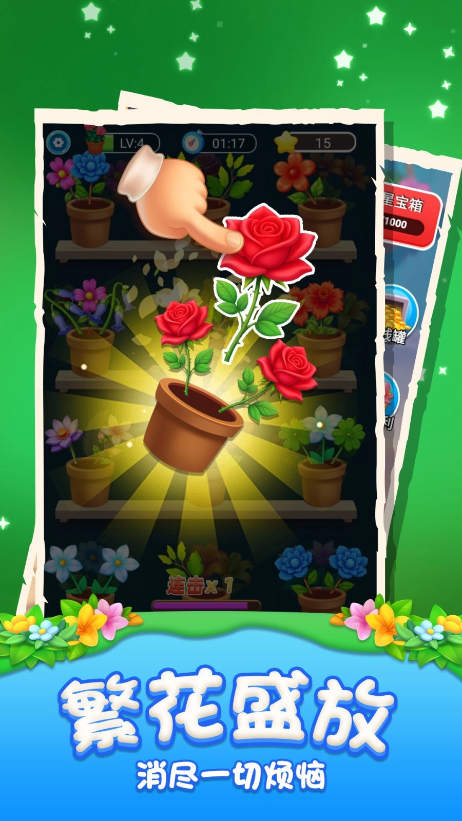 连续消除能积攒能量槽,等能量攒满后,就能手动触发园艺大师的专属技能——随机消除全屏十朵花,借此逆转当前战局。