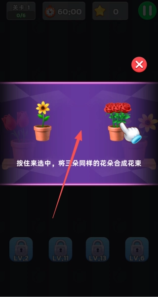玩家可以拖动相邻的花朵来交换它们的位置,一旦在横向或纵向出现三个及以上相同的花朵,就会触发消除效果,并且该次消除会被统计到得分当中。