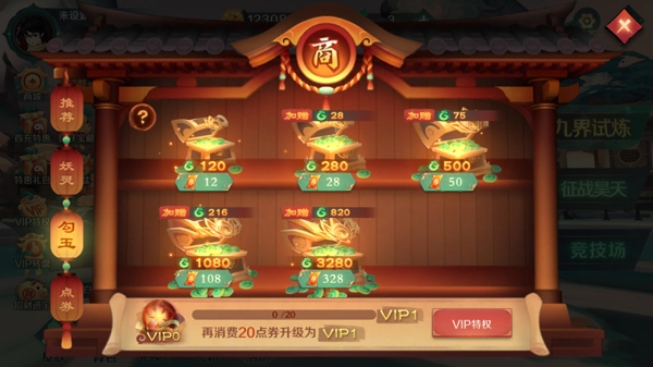 消费20点券即可升级VIP1,VIP1至VIP9各等级均赠送最高可开出对应数量妖灵的VIP豪礼,VIP1每日1次VIP幸运转盘;VIP2妖灵为0时每日3次领取200万救济金、赠送V2专属“天元应龙”皮肤套装、每日1次VIP幸运转盘;VIP3每日首次登录妖灵不足400万补给至400万、每日1次VIP幸运转盘;VIP4妖灵宝鉴直升Lv12解锁BOSS召唤等玩法、每日首次登录妖灵不足1000万补给至1000万、开放号角召唤BOSS、每日2次VIP幸运转盘;VIP5妖灵宝鉴直升Lv14解锁狐妖和机械博士召唤、每日首次登录妖灵不足2000万补给至2000万、赠送V5专属“混元无极”皮肤套装、开放号角掉落(需20万级及以上道符击败BOSS有几率)、每日2次VIP幸运转盘;VIP6妖灵宝鉴直升Lv16解锁金珠法王等召唤、每日首次登录妖灵不足4000万补给至4000万、每日2次VIP幸运转盘;VIP7妖灵宝鉴直升满级解锁哪吒等召唤、每日首次登录妖灵不足10000万补给至10000万、每日首次登录获四色锻造材料各5个、赠送V7专属“紫虚真龙”皮肤套装、每日3次VIP幸运转盘、提高打怪概率、妖王竞技场积分加成5%;VIP8每日首次登录妖灵不足20000万补给至20000万、每日首次登录获四色锻造材料各10个、每日3次VIP幸运转盘、提高打怪概率、妖王竞技场积分加成7%;VIP9每日首次登录妖灵不足40000万补给至40000万、每日首次登录获四色锻造材料各15个、每日4次VIP幸运转盘、提高打怪概率、妖王竞技场积分加成10%。