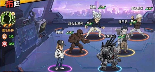 3、该阵容在金属骑士BUFF加成下,以KING为核心输出,饿狼辅佐补齐伤害。在封锁敌方两点能量值同时亦可打出爆炸伤害。