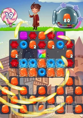 6、把4颗糖果连在一起会形成强力的魔法特效,启动它会消除直线上的所有糖果