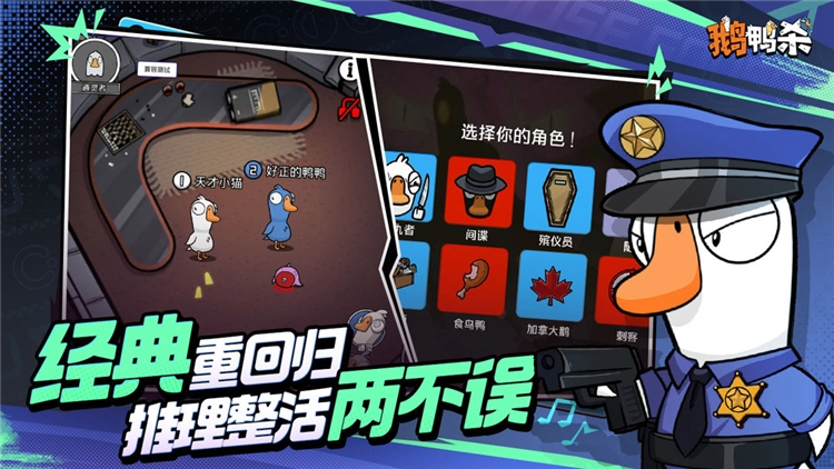 《鹅鸭杀》正版作为一款多人联机社交推理游戏,以“鹅”“鸭”“中立角色”三方阵营对抗为核心,玩家需在5-16人局中完成任务或淘汰对手;游戏包含50+可选角色(如鹈鹕、加拿大鹅、新角色巫医/布谷鸟)、9+地图(老妈鹅飞船、地下室等)、6+模式(经典、腐化模式等),还设有私人/公共大厅、休息室娃娃机(消耗游戏代币获取装扮),以及火鸟节等季节性活动(解锁任务竞赛得特殊代币换限时装扮);新手需先切换简体中文,通过好友列表(输入昵称+号码添加)创建房间(可设公开/私人,复制链接邀好友),对局中鸭子可利用“关灯任务”(地下室自动恢复、飞船需修复)限制好人视野(观鸟者技能失效),新角色巫医能远程凝视击倒玩家、布谷鸟可下蛋孵化幼鸟追击其他鸟类,游戏还优化了帧率、服务器质量及UI,为玩家带来兼具策略推理与趣味社交的体验。