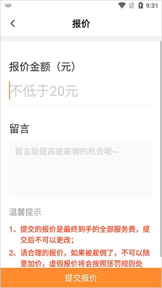 3、在报价页面,依据服务需求填写合理的服务价格、预估服务时长等相关信息,确认所有内容准确无误后,点击屏幕右下角的“立即报价”按钮,即可进入提交确认的环节。