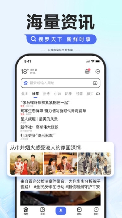 百度手机版包含常用小程序、首页底部可快速进入视频频道、具备强大的搜索引擎、精选新闻资讯等优质内容、加入最懂中文的语音识别技术、提供海量正版小说且支持多台设备自动云同步。
