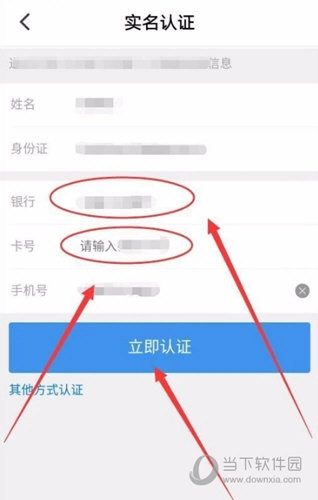 4、输入姓名、身份证、银行、卡号及手机号,点击【立即认证】。