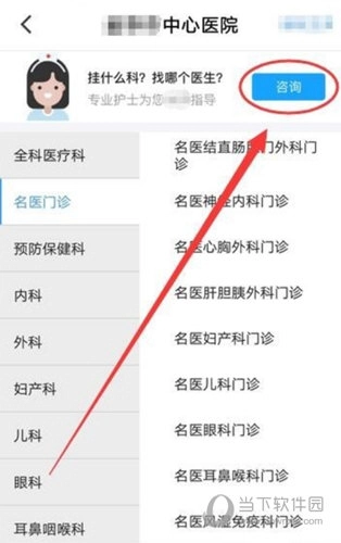3、进入预约医院后,选择就诊所需的科室,我选择的是名医门诊,若不清楚该选哪个科室,可点击右上方的咨询按钮。