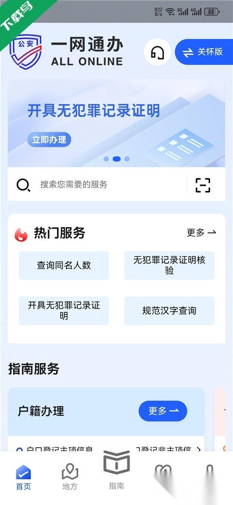 进入首页后,能看到查询同名人数、备案机动车、核验无犯罪记录证明、申请民航临时乘机证明等多种功能。