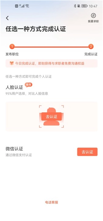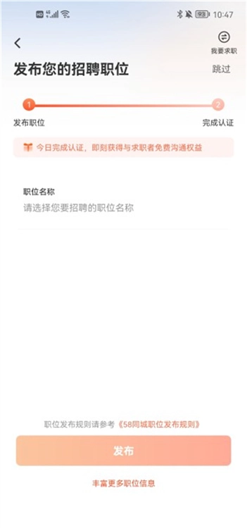 选择职位后,填写薪资范围、工作区域及详细地址,填写完成后点击页面底部的【发布】,完成认证即可。