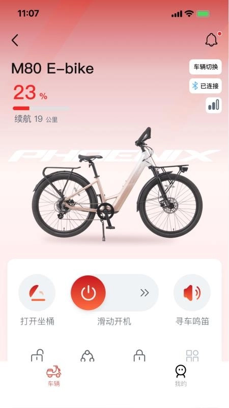 凤凰智电最新版是一款专注于智能骑行设备控制与管理的服务软件。用户可在软件内在线添加并绑定自己的车辆,通过蓝牙连接后,能实时监控和记录骑行数据,让每日骑行情况清晰直观。此外,软件支持远程控制车辆的开关机、寻车鸣笛等功能,还能对车辆进行实时定位,帮助用户快速找车、防止丢失,让车辆操控更智能、便捷、简单,实现随时随地的掌控,为日常骑行带来便利。同时,软件还允许用户将车辆与家人共享,让家人也能轻松操控使用,非常实用。有需要的用户不妨下载凤凰智电免费版体验!
