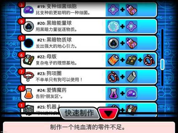 重要的话说三遍,电池非常重要电池非常重要,一定要多拿。但是每种原料最多拿10个,背包就满了。比如电池拿了10个,你就不能再拿第11个了。因为你会发现,超过10个电池了之后,新电池的你拿不了,旧电池你也扔不掉。要减轻背包重量,必须把一些原有的组合成新的,所以我感觉这个设定不太合理。