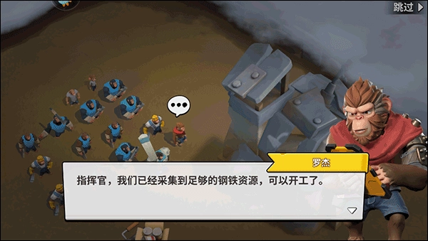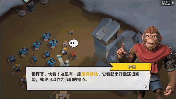 运行游戏后,解救同伴后来到初始迷雾观看剧情,接着在基地清理收集,随后发现废弃基地,然后收集材料修缮它,召集猴子收集材料,最终基地建设成功。