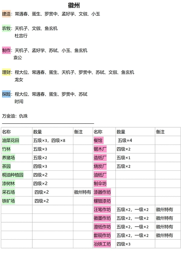 还是以徽州的特有资源为主,一级的作坊是为了完成漕运的任务,油菜花田比较多但主要承担观赏作用,因为靠徽州产的蔬菜也已经爆仓,不怎么用到。除了特有资源就是生产茶叶、竹子、铁矿、铁板。