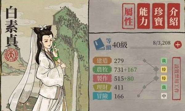 白素贞非常适合拿来进行伐木场,因为可以减少原木的需求60%,而且还可以减少1个工人需求,是木板收集专用户。