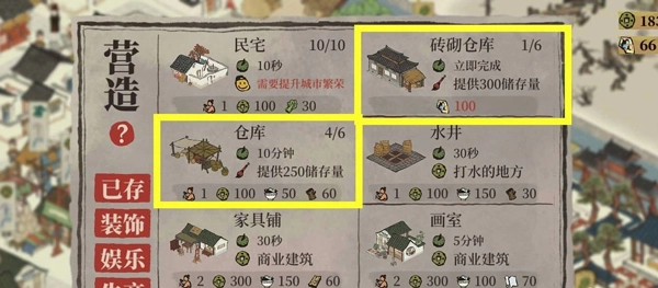 3、可以看到存储物品的仓库分为两种,一种是普通仓库,需要材料和居民建造,提供250存储量;另一种叫砖砌仓库,需要用补天石建造,提供300存储量。