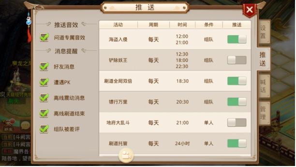 任务提醒和推送:可以自行勾选设置需要推送的内容,列如中午提醒要打海盗,铲除妖王等等,以防忘记。