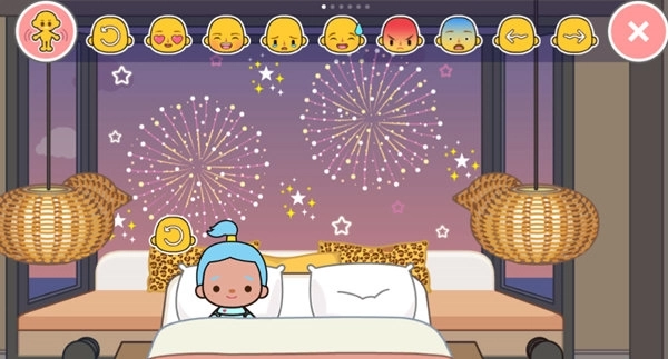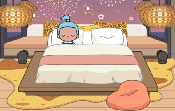 在酒店场景中,我们将人物拖动到床上是可以让其闭眼睡觉的。
