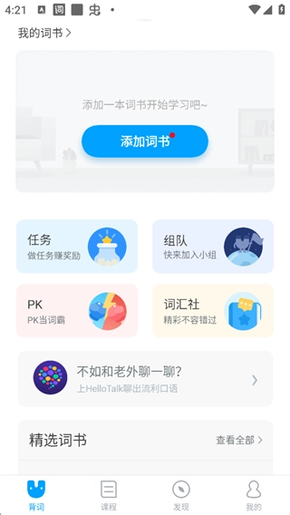 你可以添加词汇书籍开启学习之旅,还能参与任务、组队、对战等丰富项目,也能借助精选词汇书籍,通过游戏化的方式练习口语。