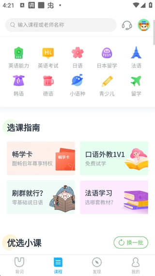 我们提供英文、日文、法文等多语言课程分类,还有选课指南帮助您选课,另外还有精选小课资源,随时可以购买学习。