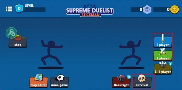火柴人至高对决拥有大量地图(新地图编辑器),支持电脑AI对战、生存模式、2人模式与朋友一起玩,有逼真的火柴人布娃娃,可创造自己的火柴人战士,有即时KO模式(禁用时水、熔岩等接触会造成伤害)且完全免费。