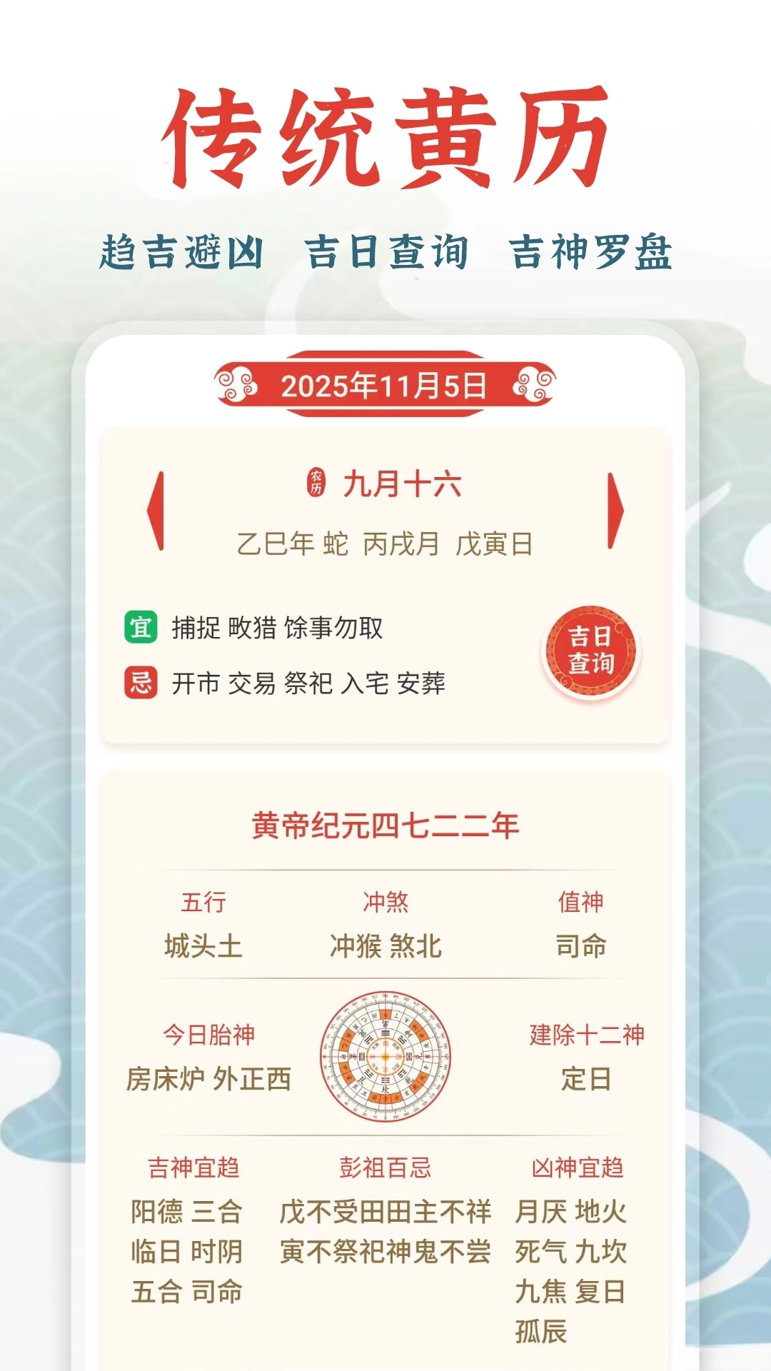 这款软件创新性地融合了传统、天气与择吉三种日历模式:传统日历清晰呈现公历与农历日期;天气日历实时更新天气状况;择吉日历则基于传统黄历,提供每日宜忌、吉日等实用信息,全方位满足用户在不同场景下的多样化需求。