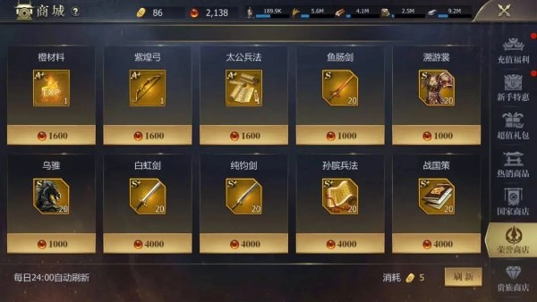 氪金大佬可以直接买战国专属和vip武将,平民玩家留着,每日买两档军令,从最高的关卡往下刷,等出活动,金锭十连抽奖必出2橙,且有消费返利的活动可以悉听尊便。