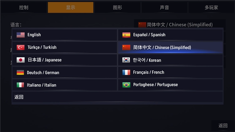 2、在显示设置中,将游戏语言切换为简体中文模式。