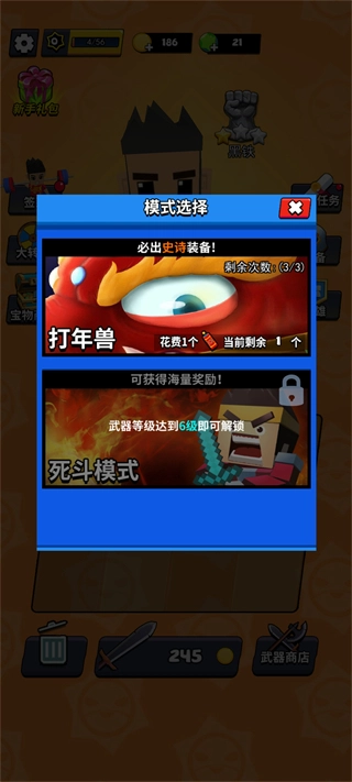 打年兽模式是所有玩家均可参与的休闲福利玩法,限定时间内合力攻击年兽,输出越高奖励越丰厚,奖励含大量钻石、武器配件与稀有道具,适合新手积累资源;死斗模式需武器等级达到6级解锁,是多人竞技玩法,玩家进入无差别对战地图,击败对手存活到最后,获胜者可获得荣誉勋章与史诗武器碎片,竞技性极强,适合追求操作的玩家。