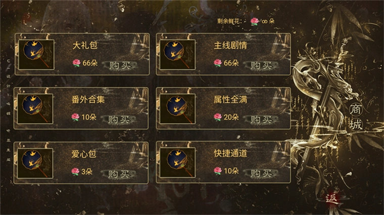 3、由于本游戏已经成功无限鲜花,我们可以打开鲜花商城直接购买大礼包、番外合集、主线剧情等物品。