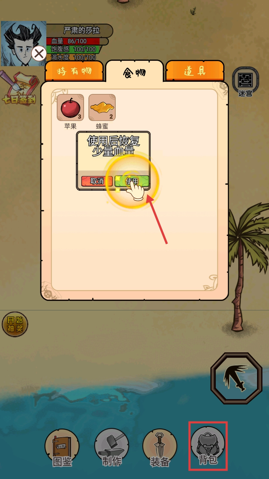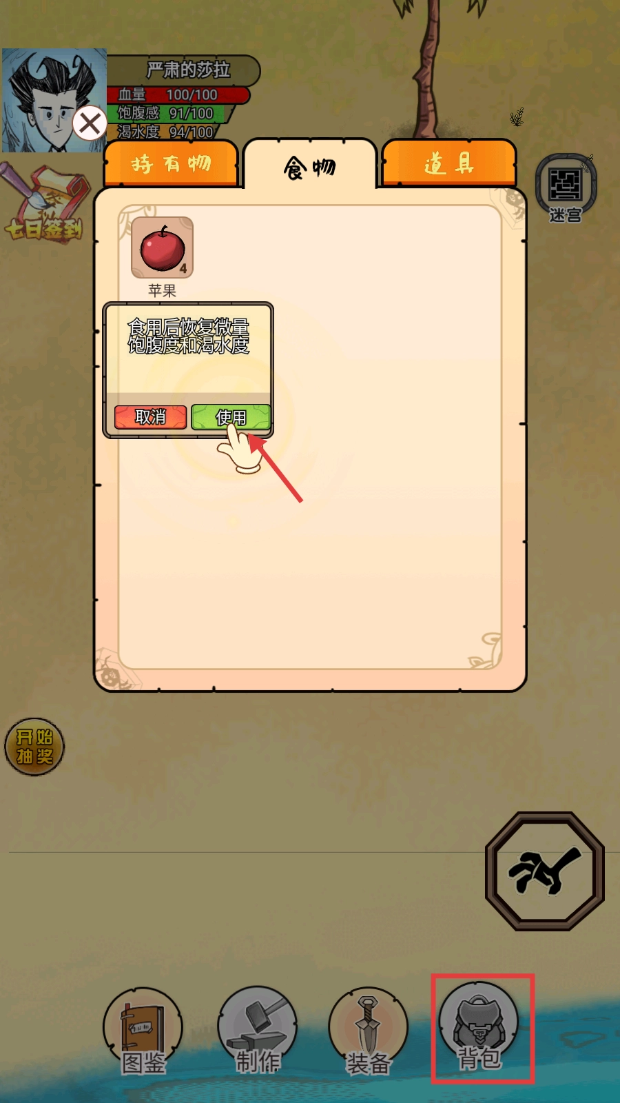 2、点击底部【背包】,选中苹果点击【使用】,恢复微量饱腹度与渴水度,维持生存状态。