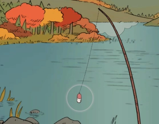 5、然后点击界面右上角的湖泊,在湖上我们可以看到一个钓鱼的鱼钩和浮标,点击它就可以开始钓鱼了。