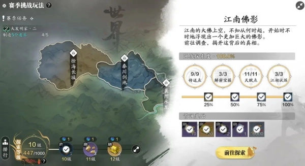 挑战玩法的核心在于探索与收集。在第一关“江南佛影”里,玩家需要开启9个传送点、解密3个宝箱、拾取11个天赋点,并完成3次江湖试炼任务。进入地图后,首先会出现3个主线探索任务,不过这些任务不会计入探索进度条。