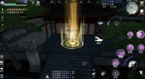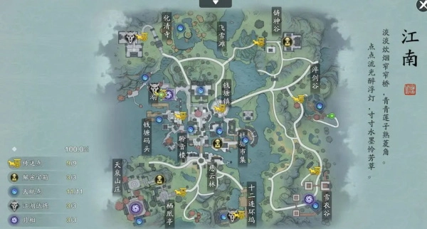 当我们进入江南探索地图后,任务栏会出现“雾中寻月-寻找散落月相”的任务,这便是我们的主线任务。小编的建议是:先完成探索主线,激活所有传送点,再开展解密宝箱、获取天赋点、参与江湖试炼等探索进度相关的玩法。