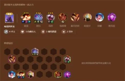 (4)阵容解析:当前测试服里最猛且操作简单的赌狗阵容,成型后基本能稳进前二,是开服冲分的首选。这套阵容需要在6级时D出3星提莫,同时还要有两个及以上的3星英雄(优先加里奥和乌鸦),这样才能让提莫升为4星。3-2阶段拉到6级开始D牌,中期只要全员达到2星就有不错的锁血效果,但最迟要在5-1阶段前D出3星提莫、3星加里奥和3星乌鸦。