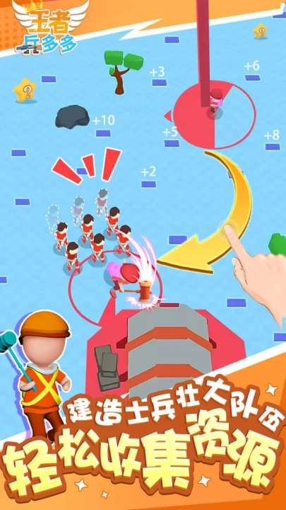 王者兵多多是一款超有趣的休闲竞技小游戏。在游戏里,你将化身营地工程师(营地颜色可以随意挑选哦),地面上那些紫色的砖块就是建造材料啦。你需要收集这些材料堆叠起来,等堆到承受不住重力时,就返回营地进行建造,以此召集更多士兵参与战斗,让自己的队伍越来越强大。接着,你还要不断收集弹药把中央炮车填满,一旦中央炮车成为你的战力,就能帮你拿下80%的胜率;这时候,你只需要把敌人引到指定的圈圈里,剩下的就等着收获王者称号吧。