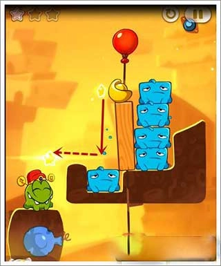 随着游戏进行,难度换不提升,第四关我们先把上面的绳子切掉,来获得前两个星星。