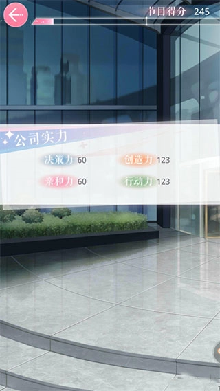 分数的总成来源于通告中的表现以及选取的羁绊所对应的关键词分数。每关的召唤羁绊环节都有实力需求的关键词提示,也就是人物的属性点,其中有决策力,创造力,亲和力以及行动力四个部分。