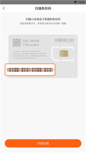 2、进入后点击下方的【开始扫描】,扫描电话卡后面的条纹码激活即可。