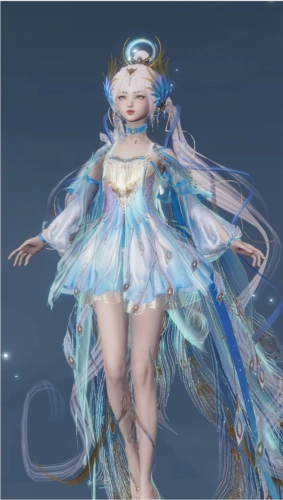 红品女装·青影弄云以青鸟为原型,色彩上选择青碧与白色,更贴近传说中的青鸟形态;在发型上,双马尾长发随风飘荡,两旁则以青鸾羽毛为点缀、娇俏可爱,头后的神环则更增添一丝神性。