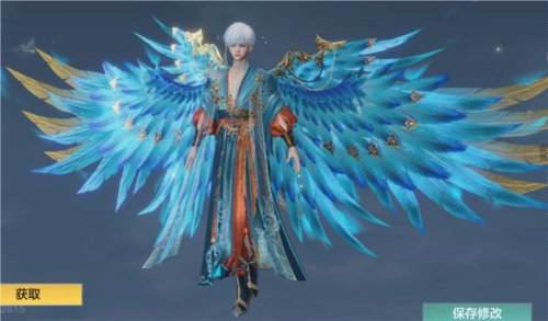 红品男装·霞掠云衿的设计元素以云为主导,并融合了青鸟与天空的特点。服饰以青鸟身披霞光送信为灵感,采用青、橙二色作为服饰主题色;开襟外装下是半透的轻纱披帛,好似青鸟在云雾间穿梭时勾连的云气。
