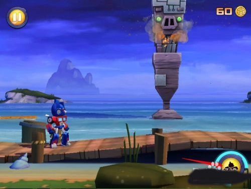 通常情况下绿猪都待在建筑物上方,游戏前期玩家还没升级变形金刚时攻击力比较弱,要是直接攻击绿猪,说不定没法在这一屏幕的跑酷过程中把它击杀。因此玩家只需打碎屏幕上红色方框里的“玻璃”,建筑物就会倒塌,绿猪都会掉进海里,射击时要按照冰块>木块>石块的优先顺序来。