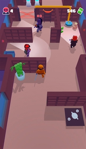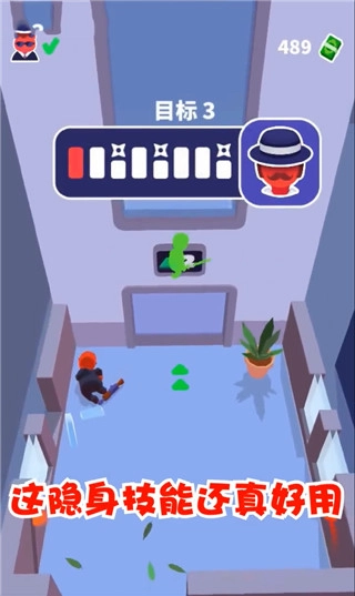 玩家开局可选择隐身技能,松开手指触发该技能变成一盆花,等待敌人视线离开后直接一刀击杀即可轻松通关。
