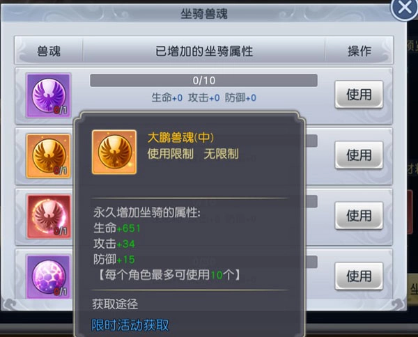 2、坐骑兽魂能够进一步提升坐骑的各种属性,为主人提供更多的加成。坐骑兽魂可从各限时活动中获得。