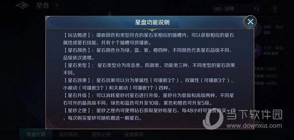 星盘是承载星石的器具,它设有10个凹槽用于镶嵌各类星石,具体为三个绿色凹槽、三个蓝色凹槽、三个紫色凹槽和一个橙色凹槽。绿、蓝、紫、橙这几种颜色的星石都包含攻击、防御、功能三类,并且每种颜色对应的每类星石仅能装配一个。