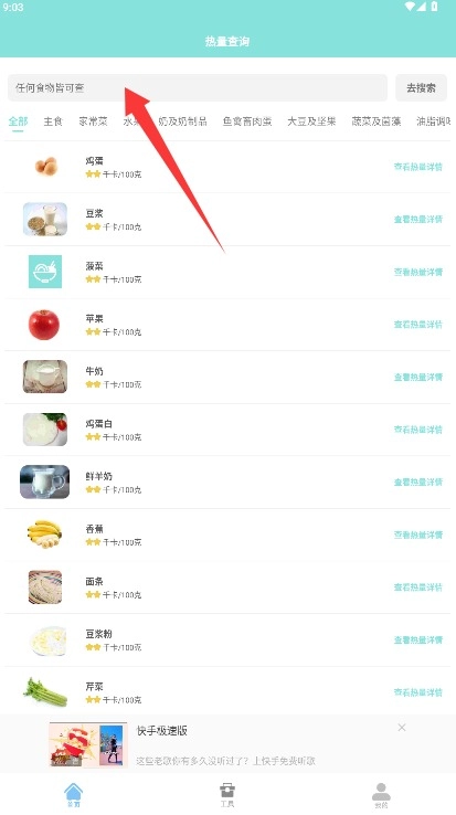 在热量查询页面输入食物名称后,点击搜索按钮即可获取该食物的相关营养数据。