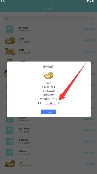 输入具体的食用重量后,系统会自动计算并展示出相应的热量、蛋白质等数值。