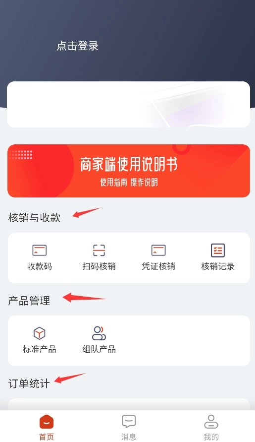 首页设有核销收款、产品管理、订单统计等核心经营功能的入口。