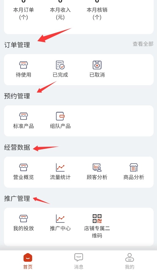 其他功能模块涵盖了订单管理、预约管理、经营管理、经营数据、推广管理等一系列运营工具。
