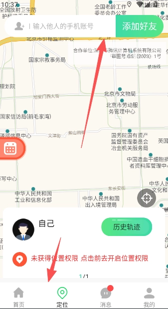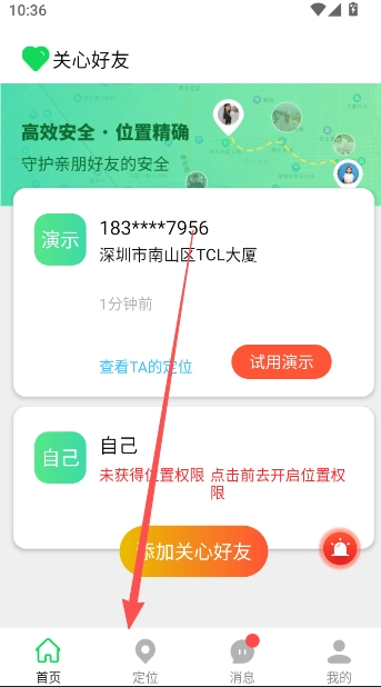 点击首页下方添加关心好友获取实时位置。