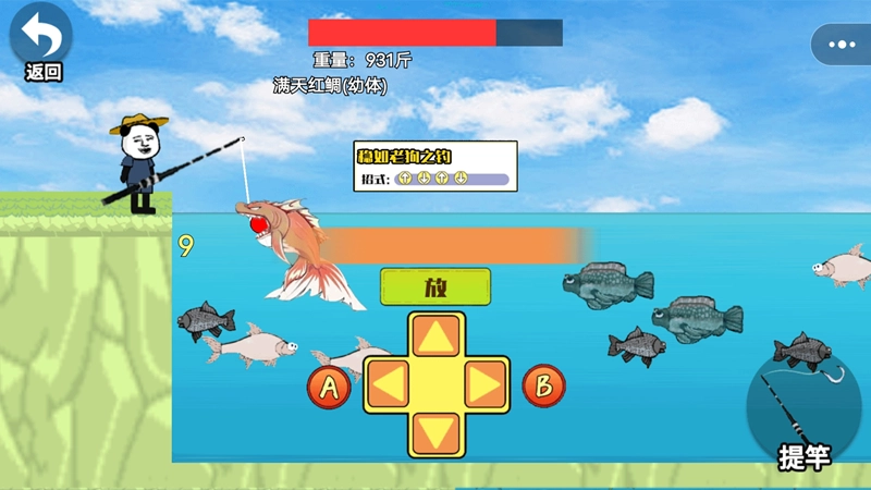 要掌握钓鱼的技巧,在垂钓时,钓到鱼后别急着马上收杆,先慢慢消耗普通鱼的体力,同时把爆气攒满,等大鱼出现吃小鱼的机会,再集中全部力气收杆。
